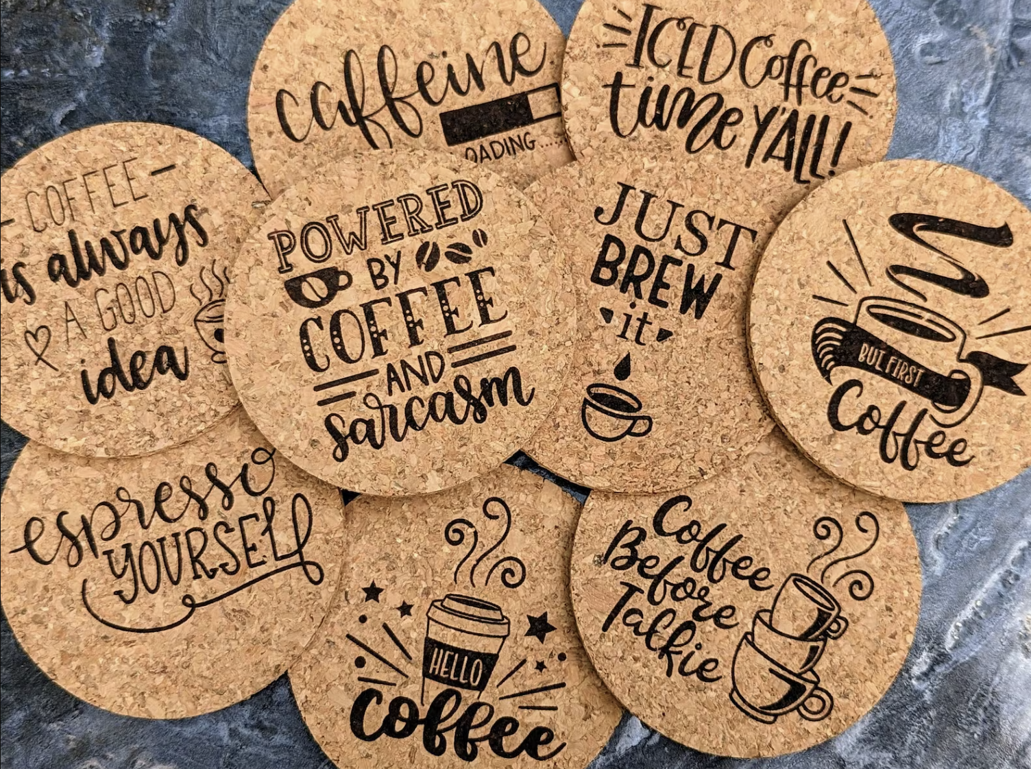 Add a touch of fun and style to your table with our delightful set of cork coasters. Each coaster is carefully crafted and designed to celebrate your choice of bevarage.Â